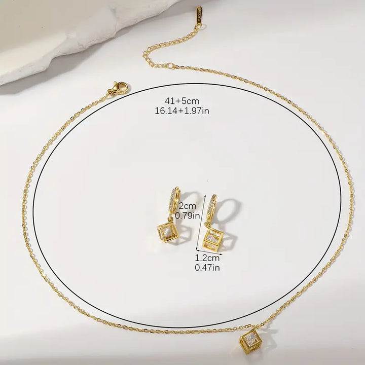 1 Fashionable Stainless Steel Cubic Synthetic Zirconia Cube Earrings Necklace Set