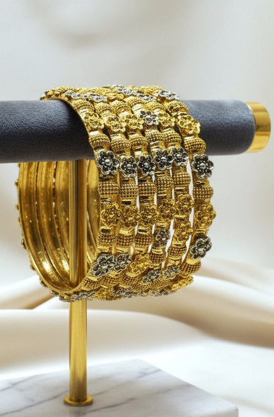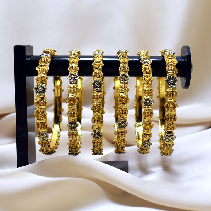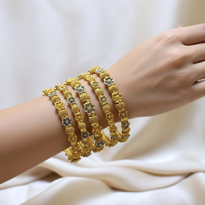 Delicate Bloom Collection: Set of 6 Gold-Plated Tiny Flowered Bangles