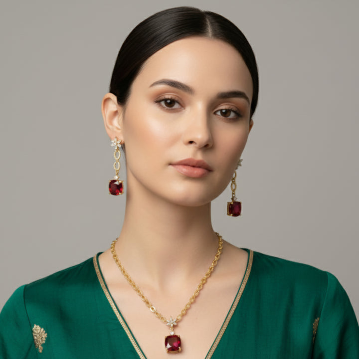 Formal Red Gemstone Necklace and Earrings Set