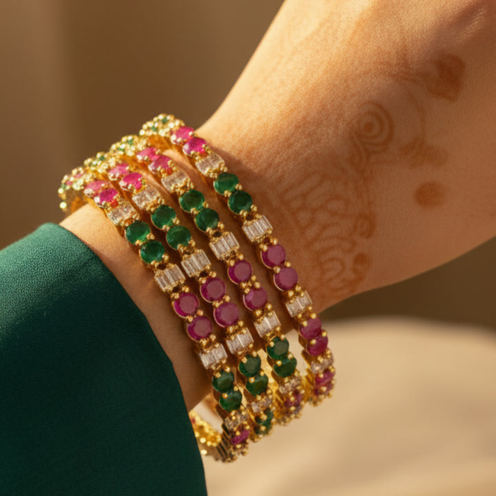Gold-Plated Ruby, Emerald, and CZ Stone American diamond Bangle Set (Set of 4)