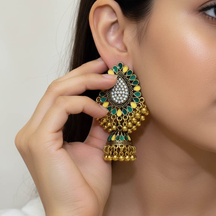Heartfelt Radiance: Crystal Heart Green and Yellow Jhumka Earrings