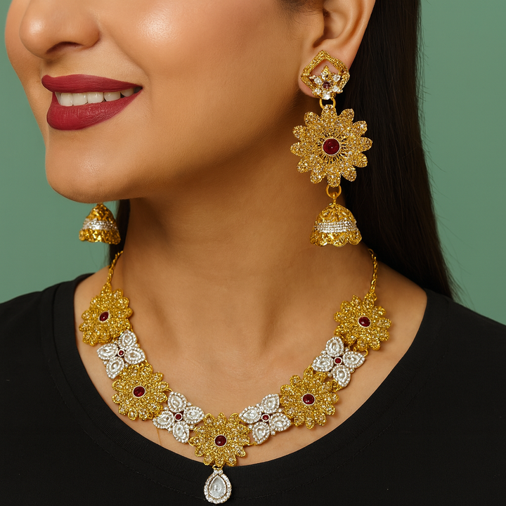 Luxury Gold-Plated Floral Bridal Set with Red Stones & White CZ
