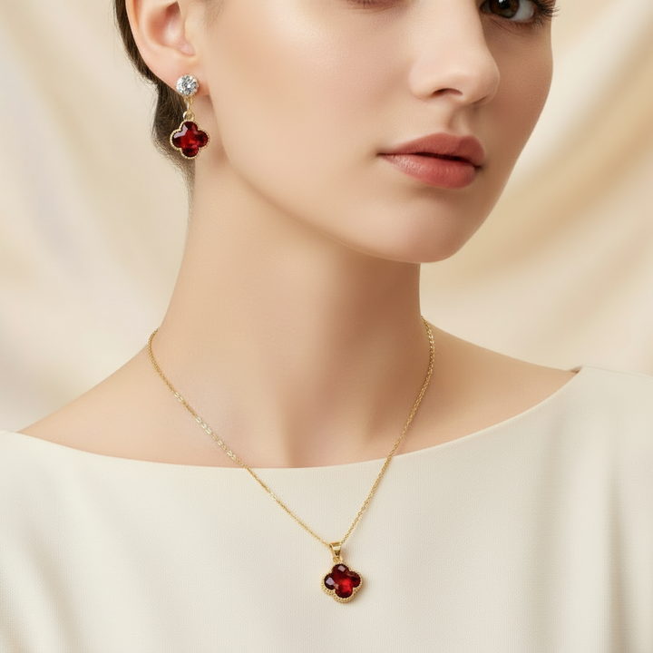 Ruby Luck: Red Four-Leaf Clover Necklace Set